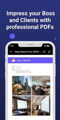 مع My Daily Report، يتم تخزين كافة تقاريرك اليومية تلقائياً بصيغة PDF عالية الجودة، جاهزة للمشاركة الفورية عبر أي وسيلة متاحة على جهازك أو للطباعة المباشرة عند الحاجة. لن تضطر بعد الآن للبحث عن وثيقة مفقودة؛ فواجهة التطبيق البديهية تضمن لك العثور على تقاريرك بسرعة فائقة، مع إمكانية التعديل السريع لتحديث أي معلومات أو بيانات ضرورية. هذا يعني تسريعاً ملحوظاً في سير العمل، توفيراً لوقتك الثمين، وتقليلاً ملموساً في النفقات التشغيلية.